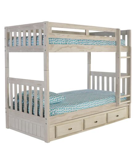 This twin over twin size bunk bed in a light ash finish provides plenty of sleeping area and storage while taking up very little space. This unit is constructed of solid wood and is ready to assemble. The three-drawer under bed unit provides ample space for storage. Mission styling with metal drawer guides and attractive pulls.