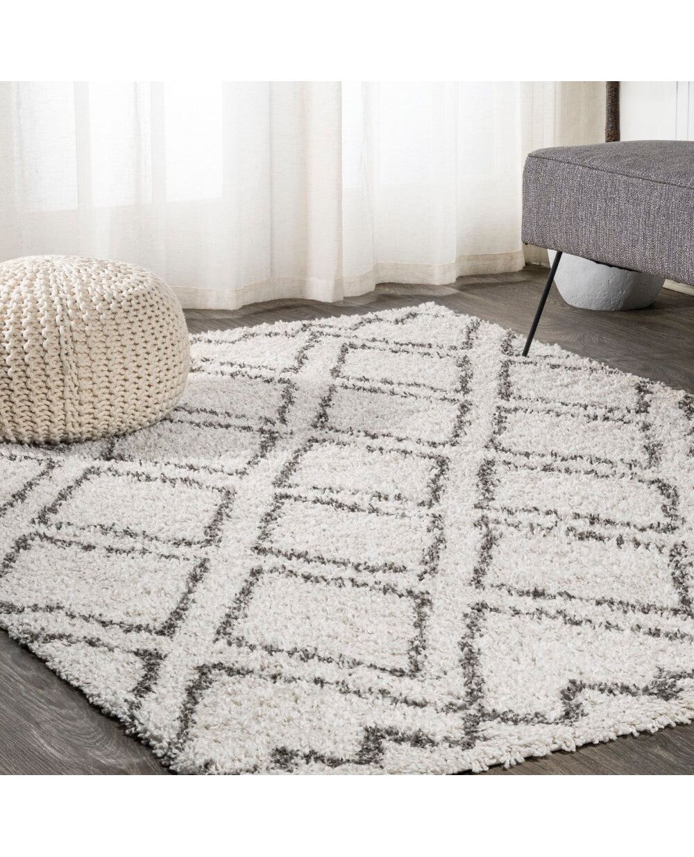 Inspired by vintage Beni Ourain rugs, our soft and fluffy shag yarns make it easy to go barefoot. Our classic Moroccan pattern has deep gray diamond trellis on a field of ivory. Anchor your Bohemian space; add softness to a bedroom, living room, or cozy reading nook; this fluffy shag rug has timeless style.