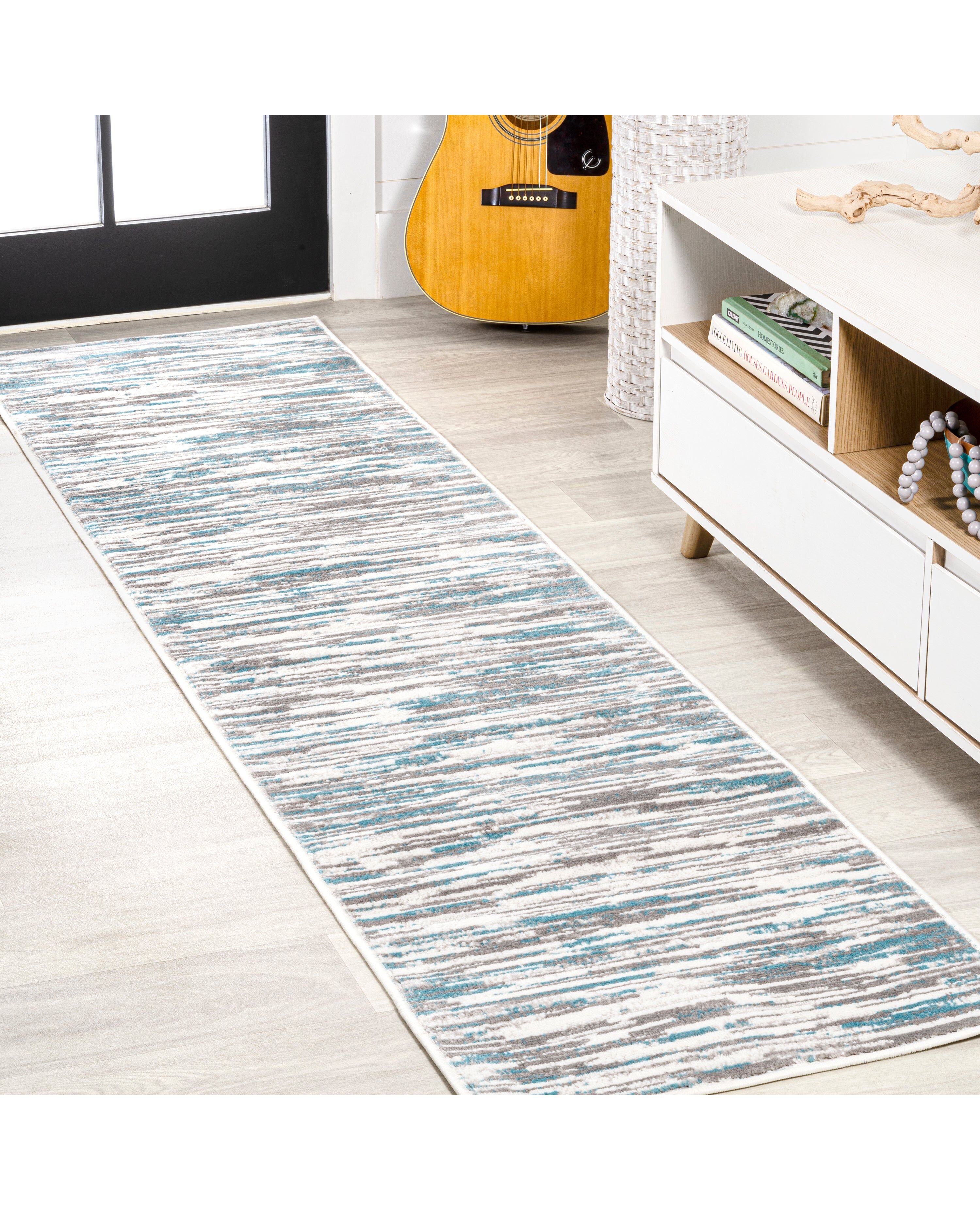 Mingled colors form an abstract stripe pattern to create a linear design with modern flair. This rug's busy pattern and gradient colors make it perfect for homes with kids and pets. It's a versatile addition to the living room, bedroom or dining room that's got a contemporary, coastal or minimalist interior.