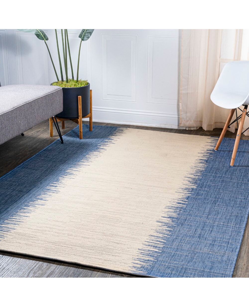 Our modern rug's denim blue border is woven with a strie effect to create a central stripe design. This versatile rug's minimalist look is perfect for a coastal cottage porch or modern outdoor patio. The simple design is a family-friendly solution for a Scandinavian style living room, modern bedroom, kitchen hallway, entry or kids bedroom. The pet-friendly and kid-proof flatweave design makes it easy to clean, and perfect for the beach house.