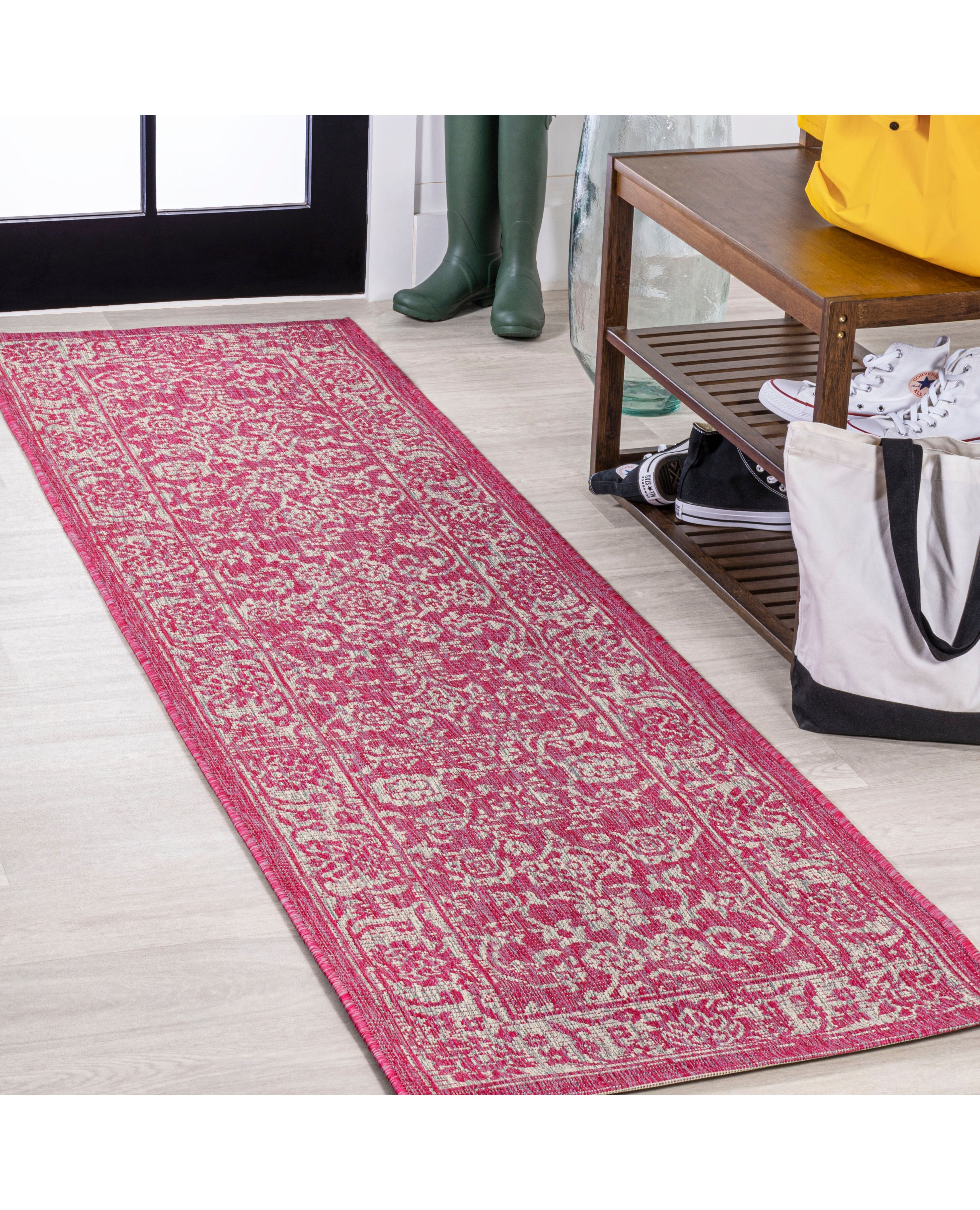 With a vine-and-border design inspired by Persian rugs, our Boho-chic rug adds eclectic style to an outdoor porch or patio. Varied tones of fuchsia mingled with a cream pattern give this rug a hand-woven, vintage vibe. The flatweave design is great for high-traffic spaces indoors too.