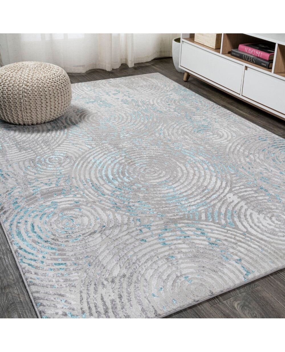 Inspired by the abstract designs of weathered concrete, this bold rug has a modern, coastal vibe. Deep turquoise and gray swirl across an ivory background. This unique rug's overall pattern makes it perfect for homes with kids and pets. It's the perfect centerpiece for a mid-century modern, contemporary, beach house or minimalist interior.