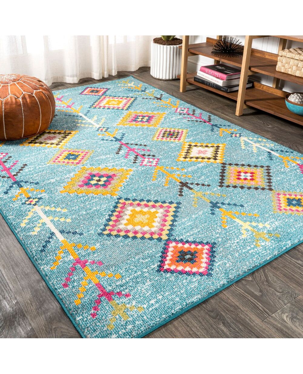 Moroccan influences abound in the colorful geometric design of this rug. Cheerful colors create a lively medallion design against a turquoise background. Add graphic impact to a modern living room, kitchen or bedroom, or make this rug part of your colorful Bohemian story.