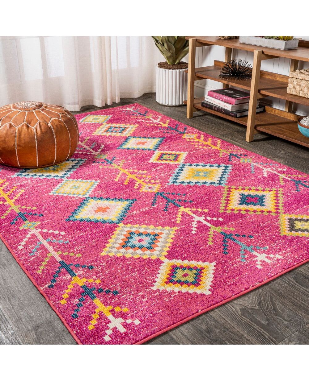 Moroccan influences abound in the colorful geometric design of this rug. Cheerful colors create a lively medallion design against a turquoise background. Add graphic impact to a modern living room, kitchen or bedroom, or make this rug part of your colorful Bohemian story.