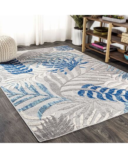Whether you live in a tropical beach retreat or just love jungalow style, the allover palm frond pattern of this rug brings the jungle home. Overlapping palm tree branches create a rich pattern of navy, aqua and khaki tones. The pet-friendly and kid-proof flatweave design makes it easy to clean.