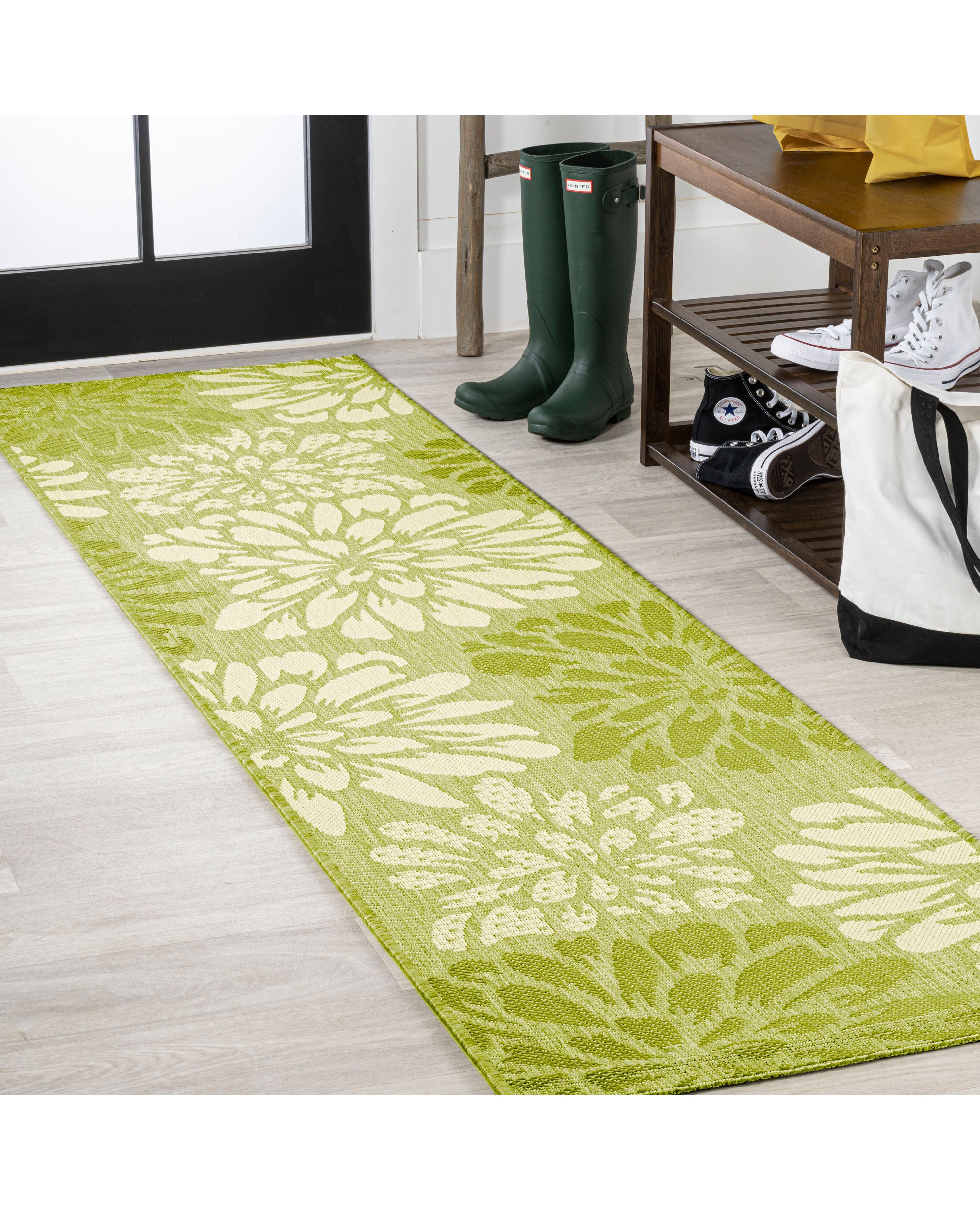 Zinnia Modern Floral Textured Weave Indoor/Outdoor Green/Cream Runner Rug