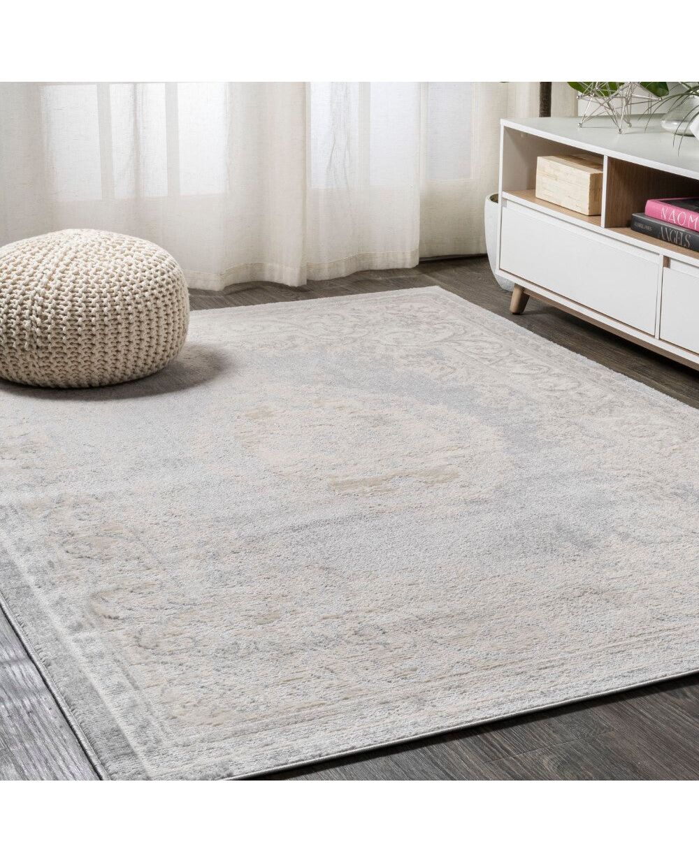 This ornate medallion rug has a scroll and floral pattern, adding modern Bohemian cottage style to a living room, bedroom, entry or kitchen. Varied tones of denim blue on an ivory background give this rug a hand-woven, rustic look. The busy allover pattern is pet-friendly and great for kids too.