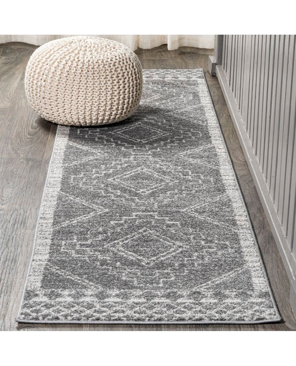 Moroccan influences abound in the geometric design of this rug. Shades of ivory create a lively medallion design against a trendy gray background. Add graphic impact to a modern room, or make this rug part of your Boho-chic story.
