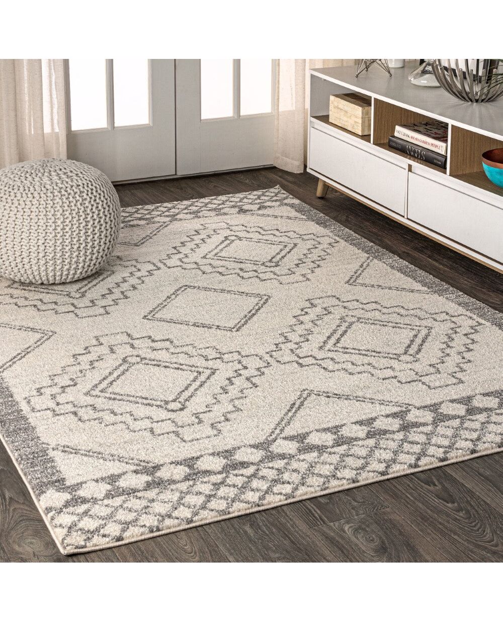 Moroccan influences abound in the geometric design of this rug. Shades of ivory create a lively medallion design against a trendy gray background. Add graphic impact to a modern room, or make this rug part of your Boho-chic story.