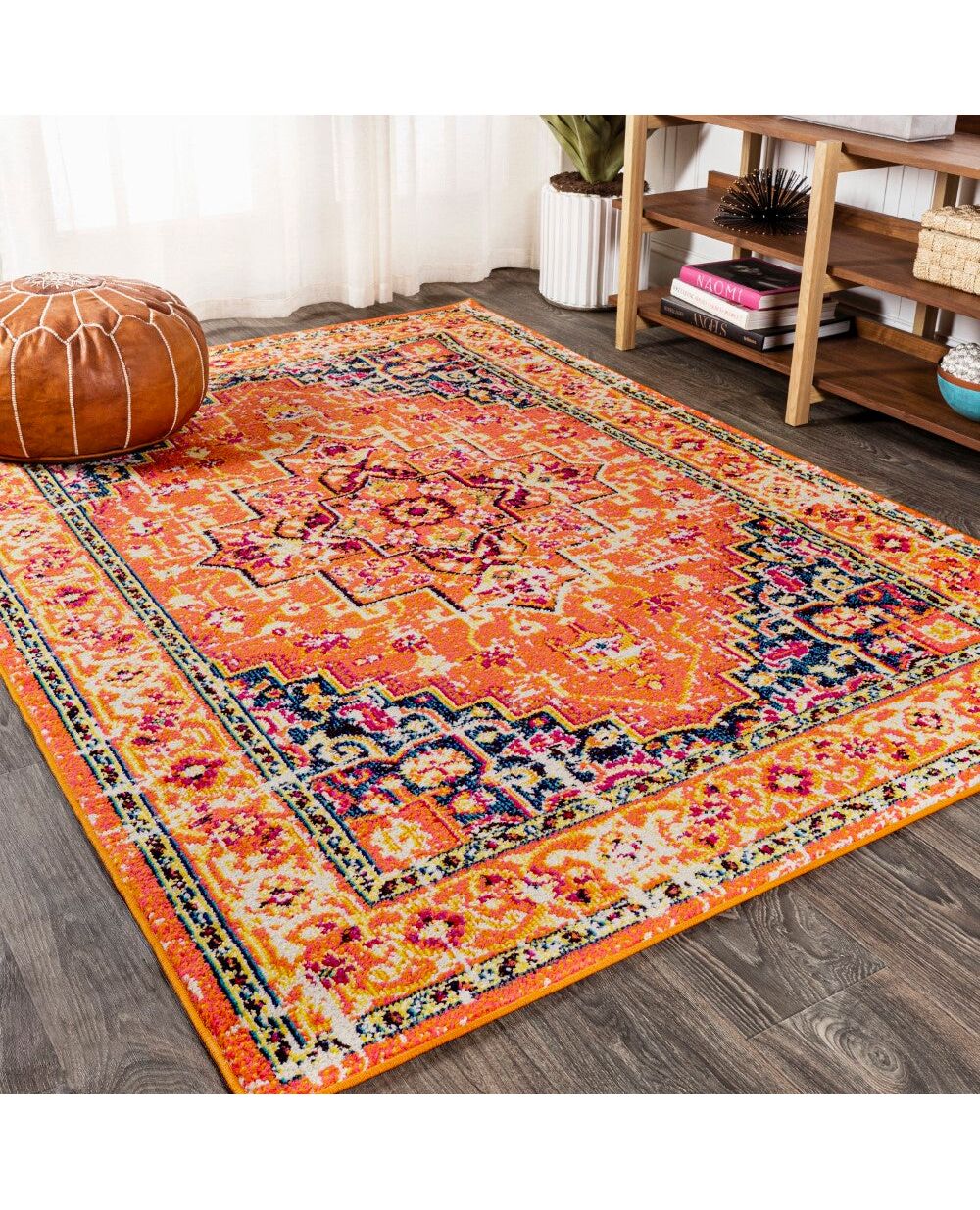 This rug's bright colors and vintage pattern add a Bohemian touch to your modern loft, Boho bedroom or colorful cottage. With its kid-friendly busy pattern, this rug is ideal for a kitchen, living room, den, bedroom or entry. An orange background, geometric central medallion, and bold color accents give this rug funky style.