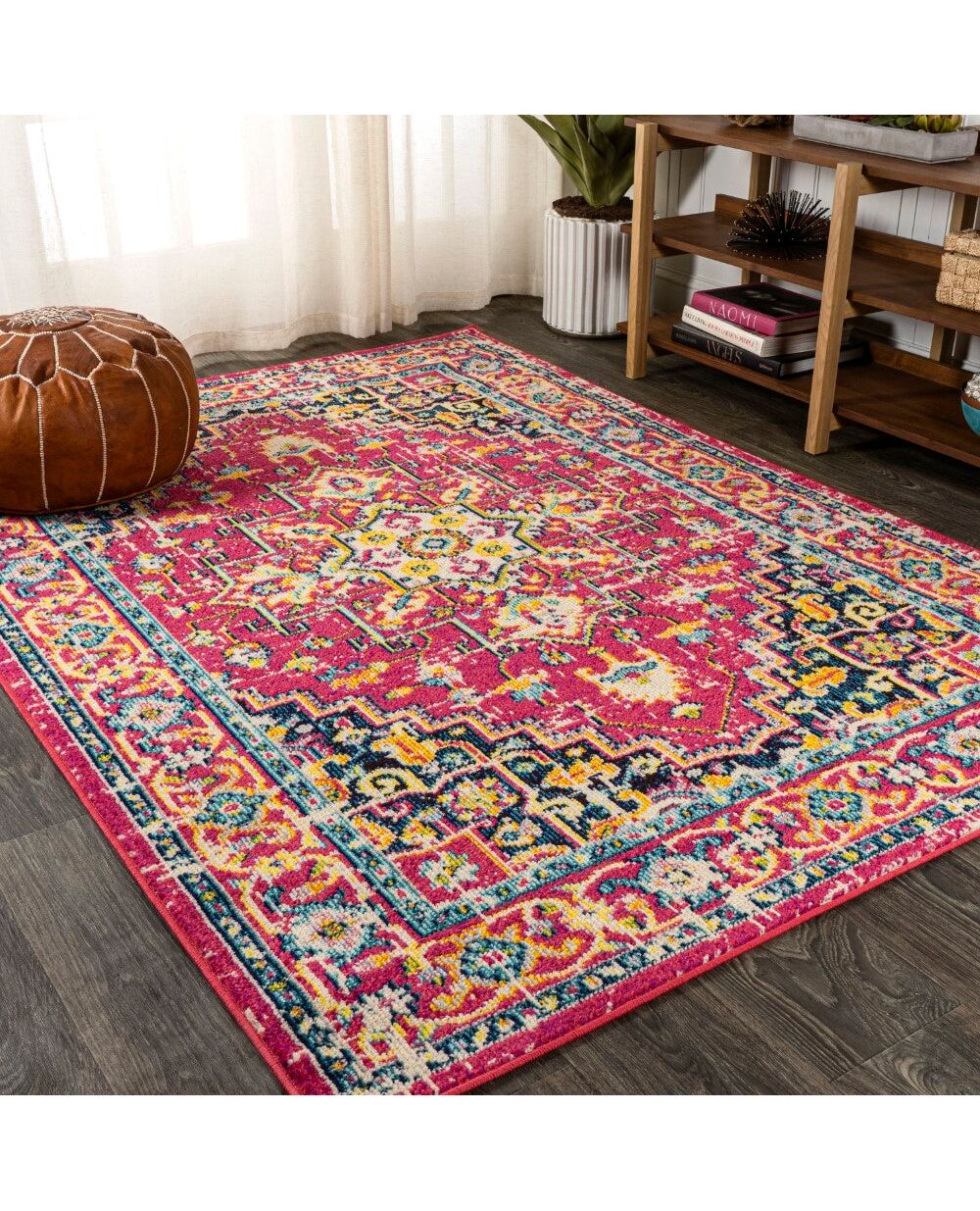 This rug's bright colors and vintage pattern add a Bohemian touch to your modern loft, Boho bedroom or colorful cottage. With its kid-friendly busy pattern, this rug is ideal for a kitchen, living room, den, bedroom or entry. An orange background, geometric central medallion, and bold color accents give this rug funky style.