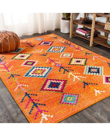 Moroccan influences abound in the colorful geometric design of this rug. Cheerful colors create a lively medallion design against a turquoise background. Add graphic impact to a modern living room, kitchen or bedroom, or make this rug part of your colorful Bohemian story.