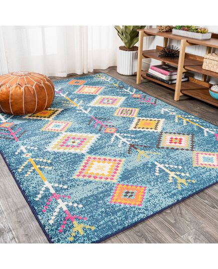 Moroccan influences abound in the colorful geometric design of this rug. Cheerful colors create a lively medallion design against a turquoise background. Add graphic impact to a modern living room, kitchen or bedroom, or make this rug part of your colorful Bohemian story.