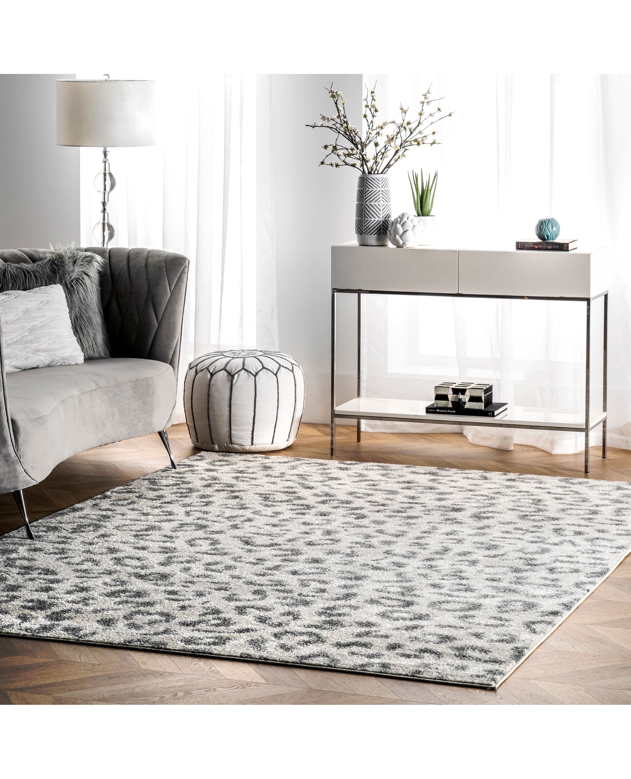 Take a walk on the wild side with this strikingly designed leopard print rug. Create a cohesive look in your living room or bedroom by pairing printed pillows with this rug. Glass topped tables and gold furnishings add an elegant touch to your space.
