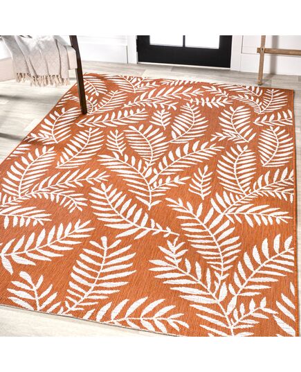 Whether you live in a tropical beach retreat or just love jungalow style, the allover palm frond pattern of this rug brings the jungle home. Scattered palm tree branches create graphic contrast in rich orange and cream tones. The busy pattern is perfect for your tropical patio, entry, kitchen, hallway, living room or bedroom. The pet-friendly and kid-proof flatweave design makes it easy to clean, and perfect for the beach house.