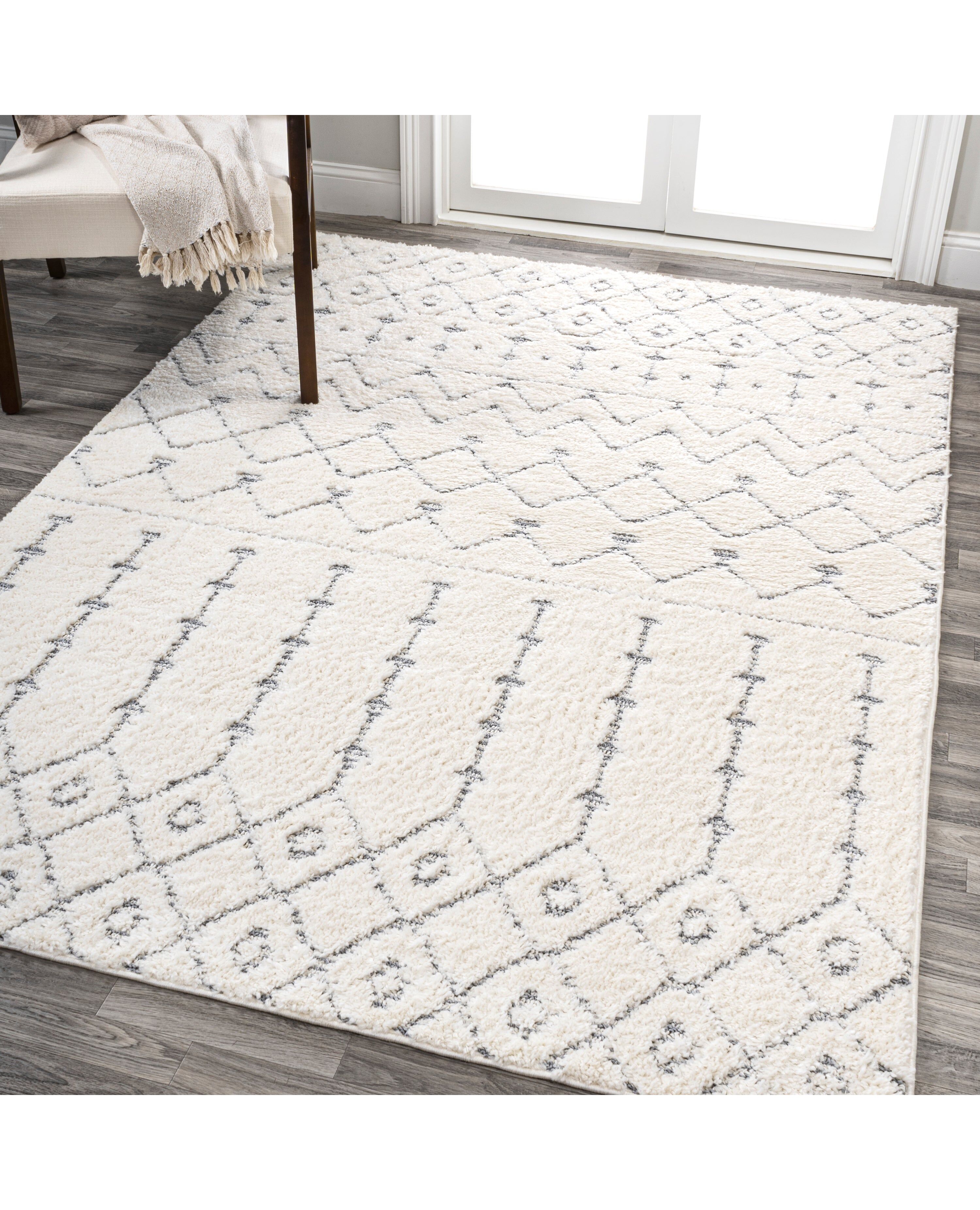 Inspired by vintage Moroccan rugs, this plush trellis rug features tribal elements and geometric diamond borders at each end. Anchor a modern space with the two-tone design, or add Bohemian flair to a bedroom, living room, dining room or home office. This neutral, easy-care rug adds bold pattern and softness to mid-century, transitional and modern interiors.