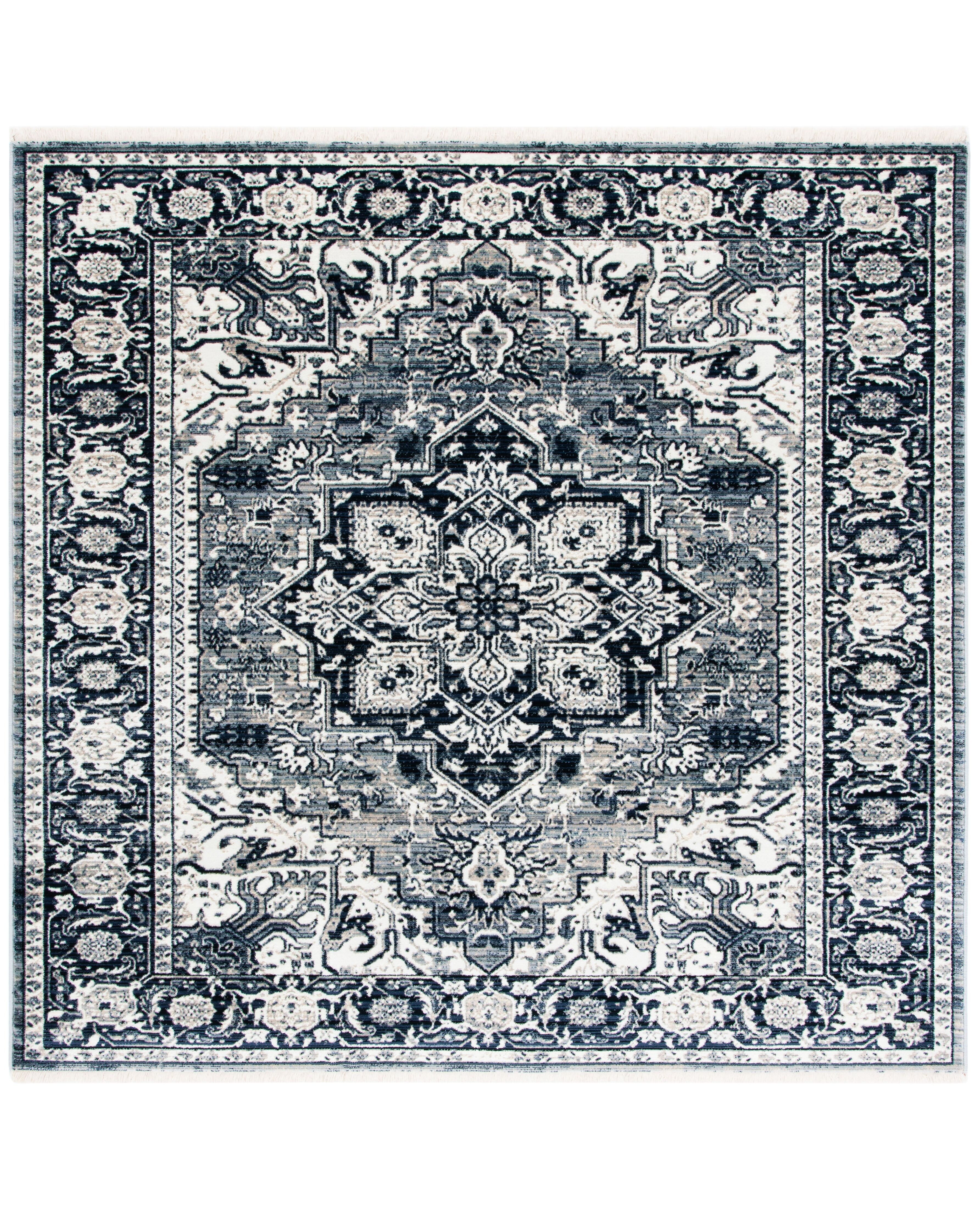 Inspired by timeless Herati rug designs, these area rugs have characteristic Oriental patterns with classic hues and elegant medallion and floral palmette details. Perfect for the living room, dining room, or bedroom, these rugs have stylish fringe detailing that pay homage to centuries old designs. Updated with a machine-woven construction of sturdy synthetic fibers, these rugs are a quality option for higher traffic areas of the home. Rug has an approximate thickness of 0.31 inches.For over 100 years, SAFAVIEH has set the standard for finely crafted rugs and home furnishings. From coveted fresh and trendy designs to timeless heirloom-quality pieces, expressing your unique personal style has never been easier. Begin your rug, furniture, lighting, outdoor, and home decor search and discover over 100,000 SAFAVIEH products today.