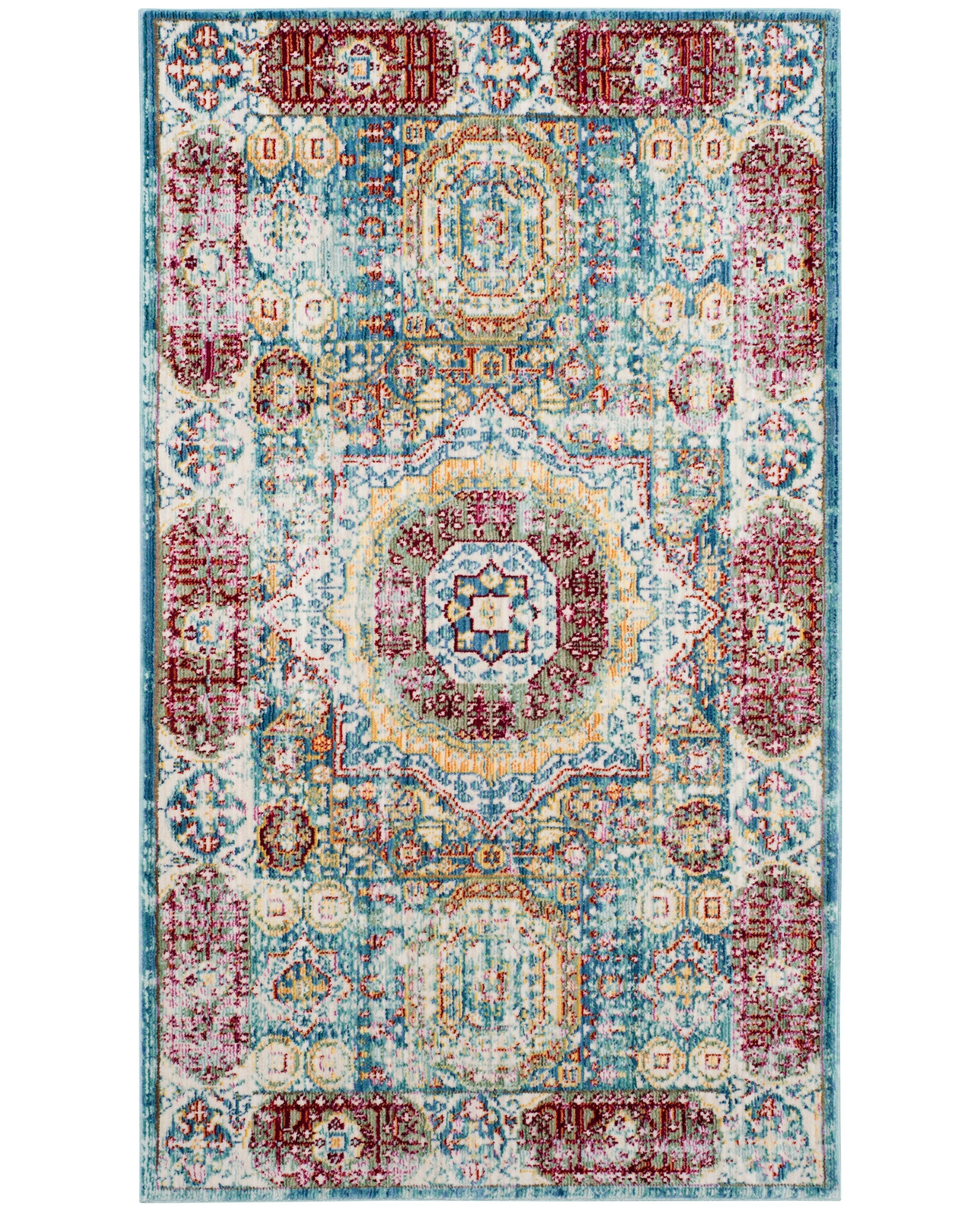 Traditional design and fashion-forward styling create a collage of color in the Valencia Rug Collection. Saturated hues pop from these overdyed rugs, with a lustrous patina lending an expressive look to Persian motifs. These trendsetting rugs are made using soft synthetic yarns with serged edges for a designer-look finish. Rug has an approximate thickness of 0.25 inches.For over 100 years, SAFAVIEH has set the standard for finely crafted rugs and home furnishings. From coveted fresh and trendy designs to timeless heirloom-quality pieces, expressing your unique personal style has never been easier. Begin your rug, furniture, lighting, outdoor, and home decor search and discover over 100,000 SAFAVIEH products today.