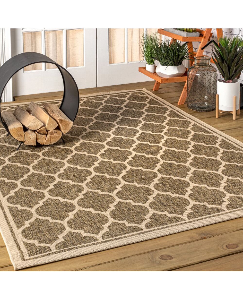 Our popular geometric design is inspired by Moroccan tile patterns. This classic rug adds eclectic style to an outdoor porch or patio. Mingled tones of deep brown with a beige ogee trellis pattern give this rug a hand-woven texture. The flatweave design is great for high-traffic spaces indoors too.