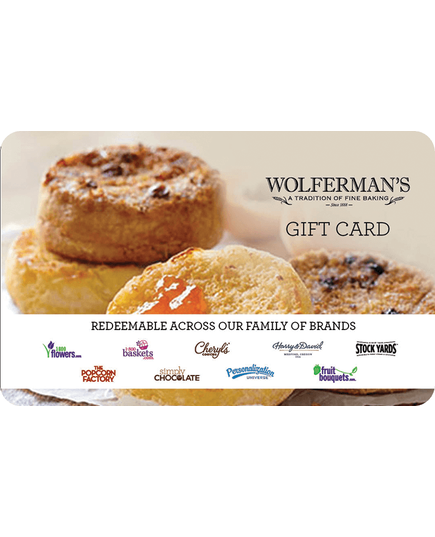 Since 1888, Wolferman’s has remained a proud purveyor of gourmet breads and pastries, honoring our time-tested recipes with only premium ingredients, from our famous, super-thick English muffins to our indulgent cakes and pies handcrafted to perfection. This gift card can also be redeemed at any of 1800Flowers.com nine brands.
