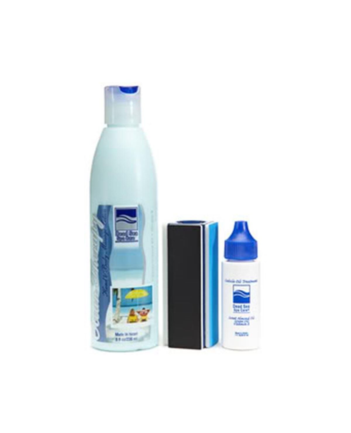 The Dead Sea Spa Care Nail kit is a three step process that will leave your hands and feet looking like you just stepped out of the salon. Dead Sea Spa Care designed a Professional, Patented Nail Buffer that will help bring out the natural shine in your nails in just seconds. After using the Dead Sea Spa Care Patented, Professional Nail Buffer, your nails will look like they have a clear coat of nail polish on them, but the difference is that they will be in their natural, healthy state. The Dead Sea Spa Care Cuticle Oil Treatment will moisturize your nail bed to promote healthy nail growth and our patented, professional nail buffer will leave your nails looking professionally manicured. The Dead Sea Spa Care Hand and Body Massage Lotion will leave your skin feeling silky smooth.Benefits Nail Buffer and Cuticle Oil promotes natural nail growth Nail Buffer and Cuticle Oil help keep nails healthy in their natural state Nail Buffer and Cuticle Oil help stimulate blood flow to the nail Cuticle Oil Treatment moisturizes nail bed Cuticle Oil Treatment heals dry, cracked cuticles Hand and Body Massage Lotion nourishes and prevents redness, peeling, dryness and cracking of the hand skin Hand and Body Massage Lotion intensify healing and cell regeneration with mineral-rich Dead Sea salts Hand and Body Massage Lotion contains numerous beneficial minerals from the Dead Sea Skin typesNormal Skin, Dry Skin, Oily Skin, Combination Skin, Mature Skin, Non-Sensitive Skin, All Skin Types.DirectionsBefore using the nail buffer, remove any nail polish from your nails, wash your hands with water and soap, and dry your hands thoroughly. Pick up the nail buffer by the finger indentions on the ends. Do not palm the buffer in your hand. Any natural oil you have on your hand will be absorbed by the material, and will keep it from working as effectively.If you have ridges on your nail, the blue side will be the first step for you. If not, the black will be your first step, and you can use this blue side as an emery board. If do you have ridges, buff the top surface of the nail firmly for 3-5 seconds from side-to-side. The ridges are unhealthy, and keep the nail from growing. The blue side should be used once a month, if necessary to remove ridges off the surface of the nail.The second step to using the nail buffer is the black side. Buff the top surface of the nail gently with the black side for 2-3 strokes to prepare the nail surface. This side should be used once a week.The final step is the white side. Buff the surface of the nail pressing a little more firmly from side to side for 3-5 seconds with the white side to get the great shine results. The white side should be used once a week or more often if your nail needs a shine lift. (Please note, all Cuticle Oil and Hand and Body Massage Lotion should be applied after using the buffer.)After using the nail buffer, the next step is the Cuticle Oil Treatment. We suggest keeping the Dead Sea Spa Care Cuticle Oil Treatment by your bed side and applying one small drop on each nail and massage it into your cuticle bed whether you used the nail buffer that day or not. This should be a daily treatment, but never buff your nails after applying the Cuticle Oil Treatment because you will ruin the nail buffer.The final step is the Dead Sea Spa Care Hand and Body Massage Lotion. Protect and hydrate your skin all day with Dead Sea Spa Care's rich formula blend of Sweet Almond Oil, Vitamin E, Avocado Oil and Jojoba Seed Oil used in the Hand and Body Massage Lotion. Apply a small amount if the Dead Sea Spa Care Hand and Body Massage Lotion onto your hands and massage into your skin until absorbed. For best results apply daily after showering or anytime your skin needs a moisturizing lift. It's important to use the Dead Sea Spa Care Hand and Body Massage Lotion when your skin feels dry, as well as after exposure to the sun. Apply liberally to the entire body as often as desired.Ocean Therapy kit includes The Famous 3 side Nail Buffer, which will transform your nails to make them much healthier and Shine and Dazzle without the use of harmful chemicals from nail polish The Famous Dead Sea Mineral Hand and Body massage Ocean Therapy lotion containing vitamins and minerals from the Dead Sea to achieve healthy and glowing skin The Famous All-Natural Cuticle Oil that will moisturize and cure the dry cuticle and skin around your nail