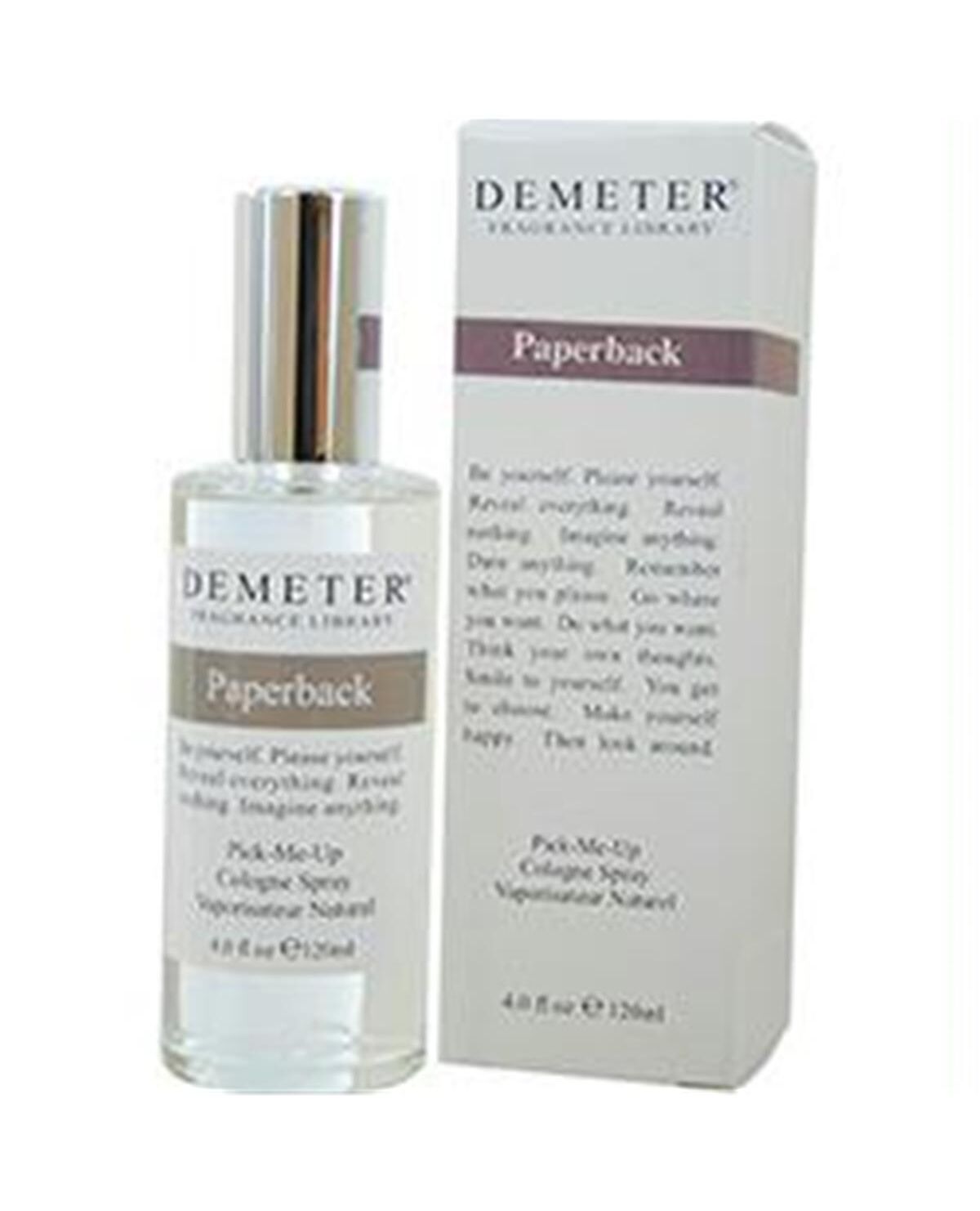 PAPERBACK COLOGNE SPRAY 4 OZ Design House - Demeter Fragrance Notes - Demeter Is A Fragrance Library With A Variety Of Scents Ranging From Cosmopolitan Cocktail To Vanilla Cake Batter WARNING - This product contains chemicals known to the State of California to cause cancer and birth defects or other reproductive harm.