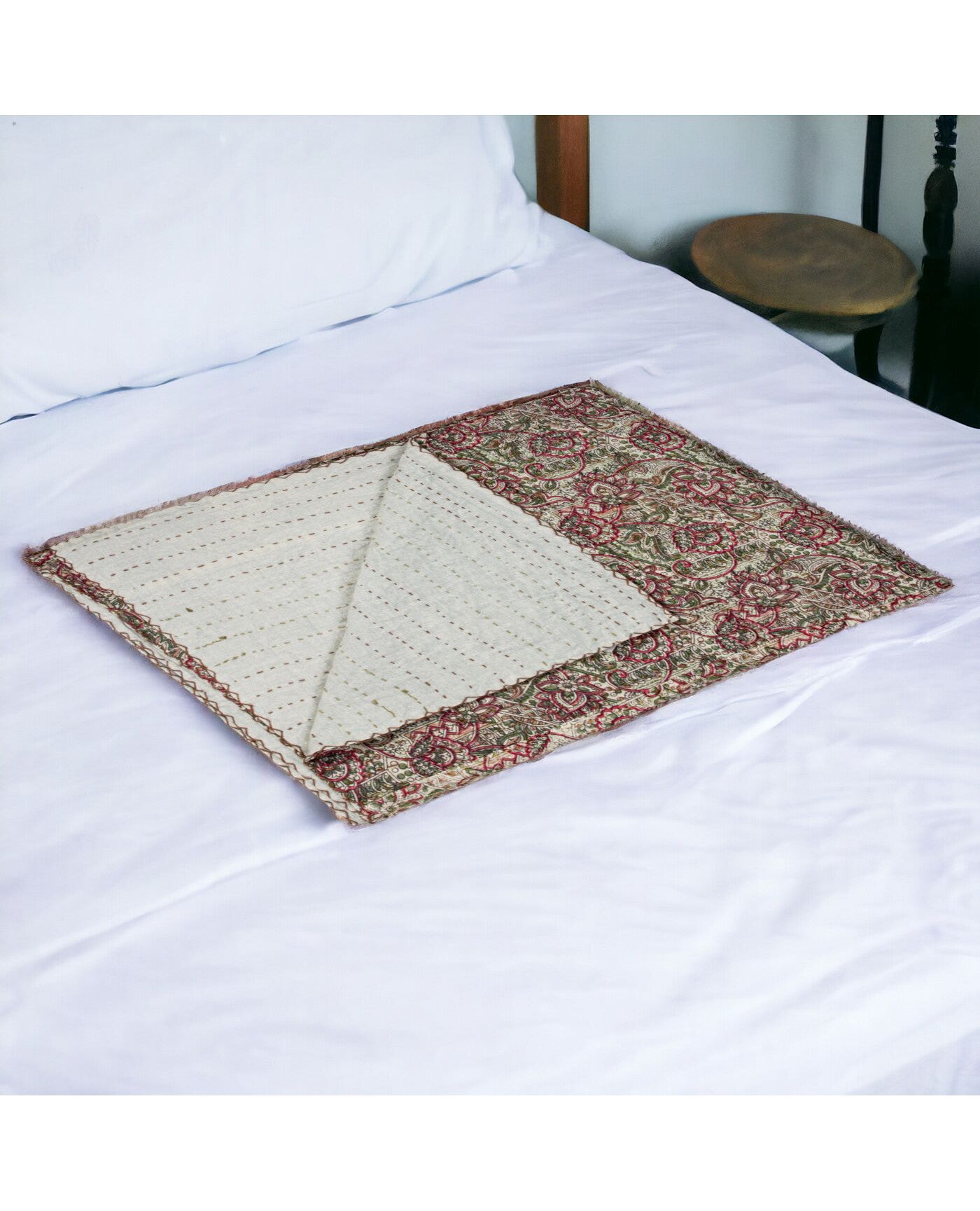 50" X 70" Green and Red Kantha Cotton Damask Throw Blanket with Embroidery