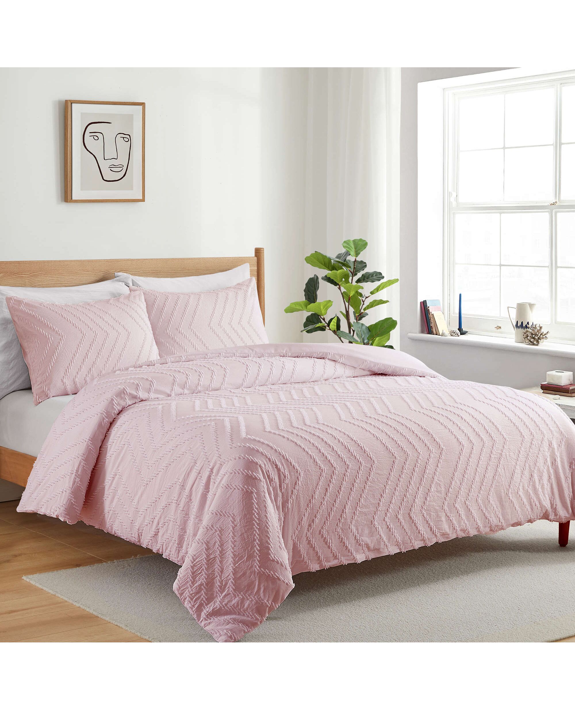 Fabric Made using 100% premium poly, the dreamy bedding duvet set is lightweight and durable. Clipped Jacquard construction offers a sumptuous sprinkle of softness and exceptional comfort into your space. Product Dimensions Twin - Duvet cover - 68 in x 90 in | Pillowcase - 20 in x 26 in Full/Queen - Duvet cover - 90 in x 90 in | Pillowcase - 20 in x 26 in King - Duvet cover - 90 in x 106 in | Pillowcase - 20 in x 36 in Twin size includes one duvet cover and one pillowcase. Full/Queen and King sizes include one duvet cover and two pillowcases. Versatility / How to Use Layer this beautiful duvet cover set with our set of solid color pillows, evoking an atmosphere of luxe and modern design into your bedroom space. Care Instructions This duvet cover set is machine washable, making it easy to maintain.
