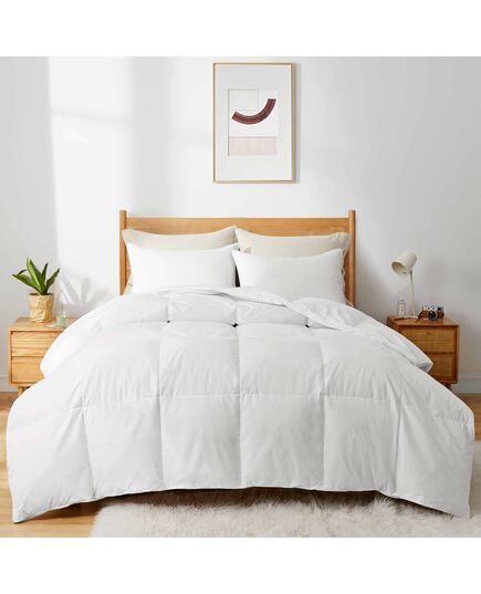 Our UltraFeather comforter is filled with quill-free natural feather and down. It is different from normal down feather comforters because it is processed an extra step to remove the solid feather quill thus giving a feather comforter a down like feel. No quills will poke through the cover. It provides softness of pure down without the inconsistency of feathers. MATERIAL - Shell - 100% Cotton, Filling - 80% Feather Fiber / 15% Waterfowl Feather / 5% Down DESIGN - box stitch design to avoid filling shifting, alternative quilt pattern, Pipping with white 100% Cotton TC 233, double needle stitch, 4 corner tabs to anchor duvet cover. KING - 106" x 90", fill weight - 106 oz. FULL/QUEEN - 90" x 90", fill weight - 88 oz. TWIN - 68" x 90", fill weight - 67 oz. CARE INSTRUCTIONS - Machine Wash HIGH TEMPERATURE DISINFECTION - The filling down and feathers are sterilized through HTD rather than a chemical way to ensure the least chemical substances left during production process, which also reduce the risk of allergy. RESPONSIBLY SOURCED - The down and feather used in our products has been certified to the RDS (Responsible Down Standard). RDS is an voluntary global standard aiming to ensure that down and feathers come from animals that have not been subjected to an unnecessary harm.