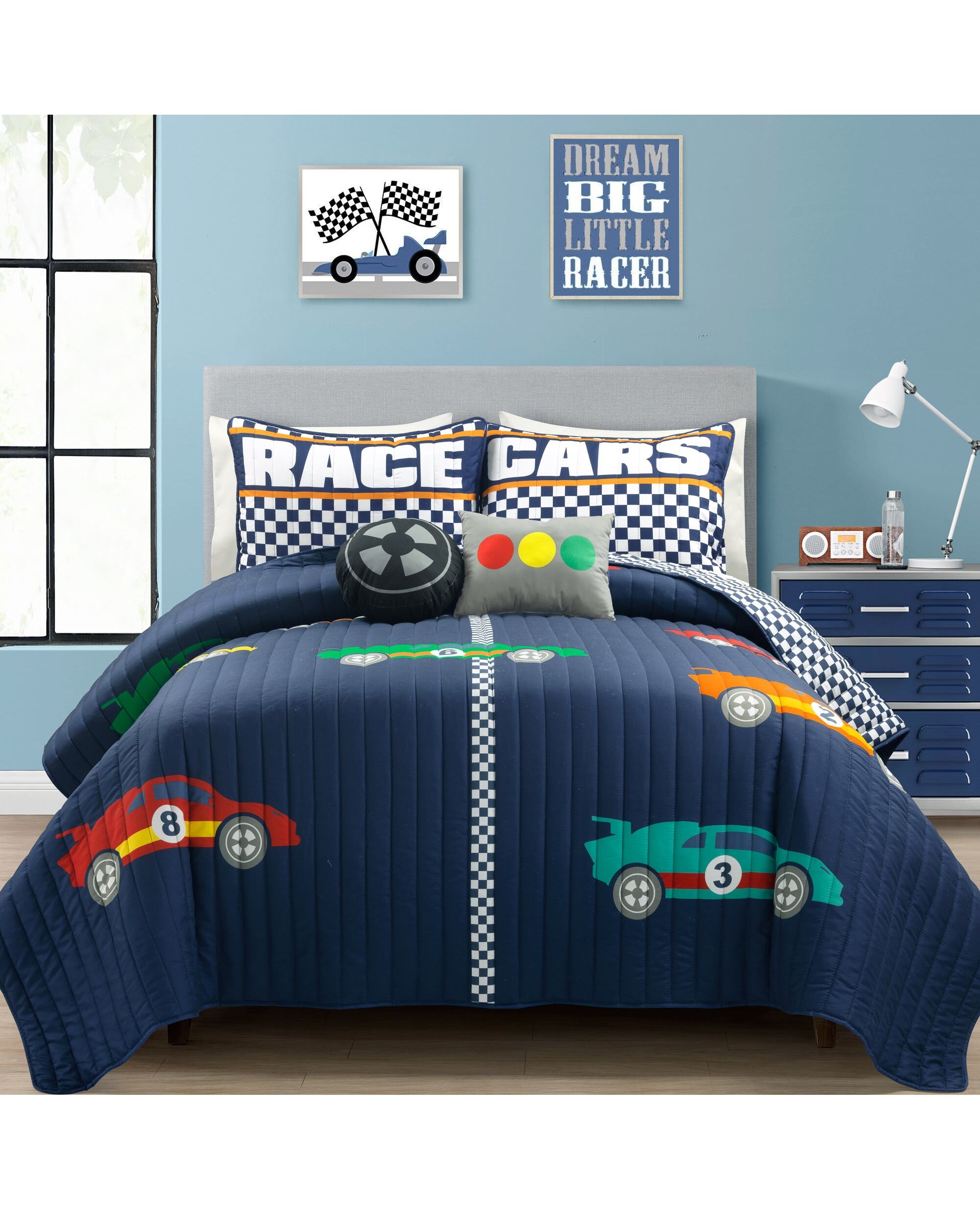 Racing Cars Reversible Oversized Quilt White 4Pc Set Twin