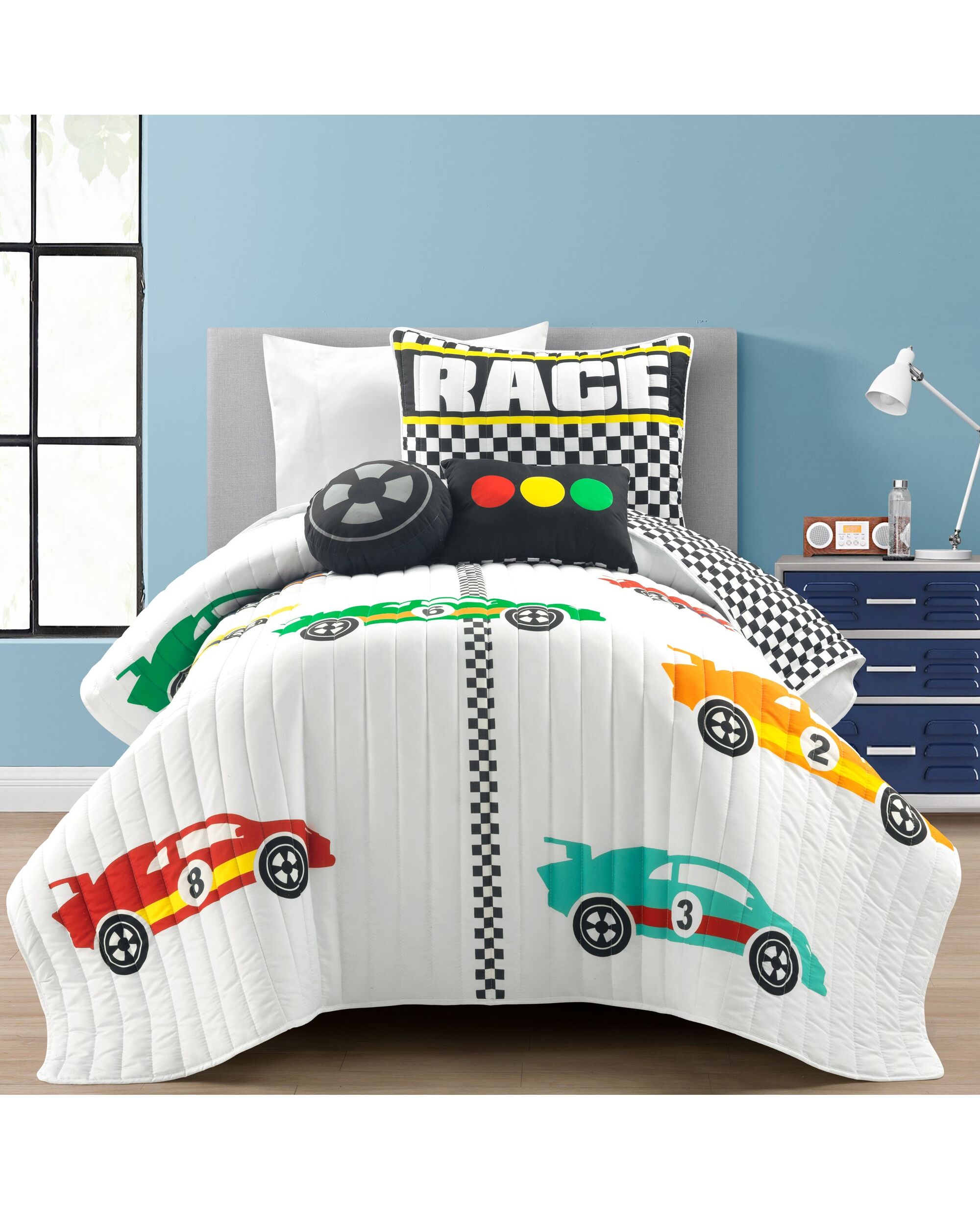 Racing Cars Reversible Oversized Quilt White 4Pc Set Twin