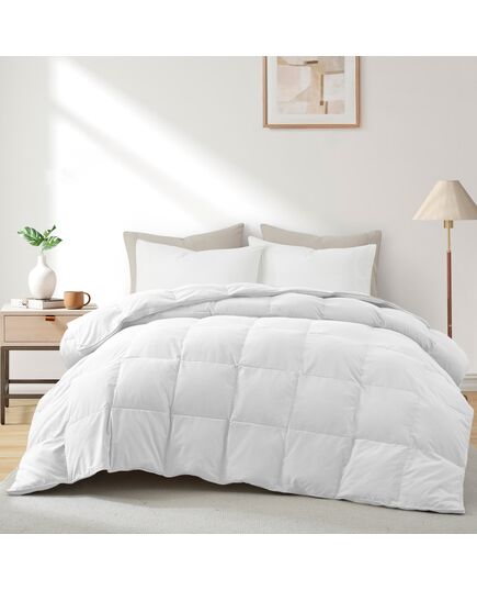 Fabric It is composed of 92% premium polyester and 8% nylon, can provide a soft, durable, lightweight, moisture-wicking, and easy-to-care-for bedding option that is suitable for year-round use. Fill It is comprised of 95% feather fiber and 5% white goose down filling. This quill-free natural feather comforter is treated with an extra step to remove the solid quills, unlike regular feather comforters. This lightweight blanket comforter provides the perfect level of warmth and endless comfort for you to fall into cozy sleep every time you cuddle. ConstructionDesigned with a sewn-through construction to ensure uniform distribution of the duvet filling and avoid shifting or bunching. Warmth The lightweight version is the perfect comforter for hot sleepers, summers, or for those who reside in warmer climates. Layer this lightweight comforter with an all-season comforter for extra warmth during winters. The medium weight option is an all-season version, ideal for hot or cold sleepers. It is a great pick for both a cold climate and a hot climate. Twin Size - 68 in x 88 in | Full Size - 88 in x 90 in | King Size - 104 in x 90 in | California King Size - 108 in x 94 in
