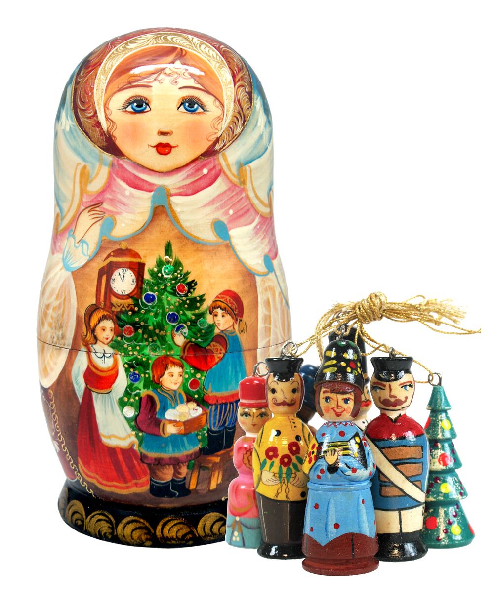 Designocracy Christmas Night Treasure Surprise Matryoshka Wooden Doll with 5 Ornaments