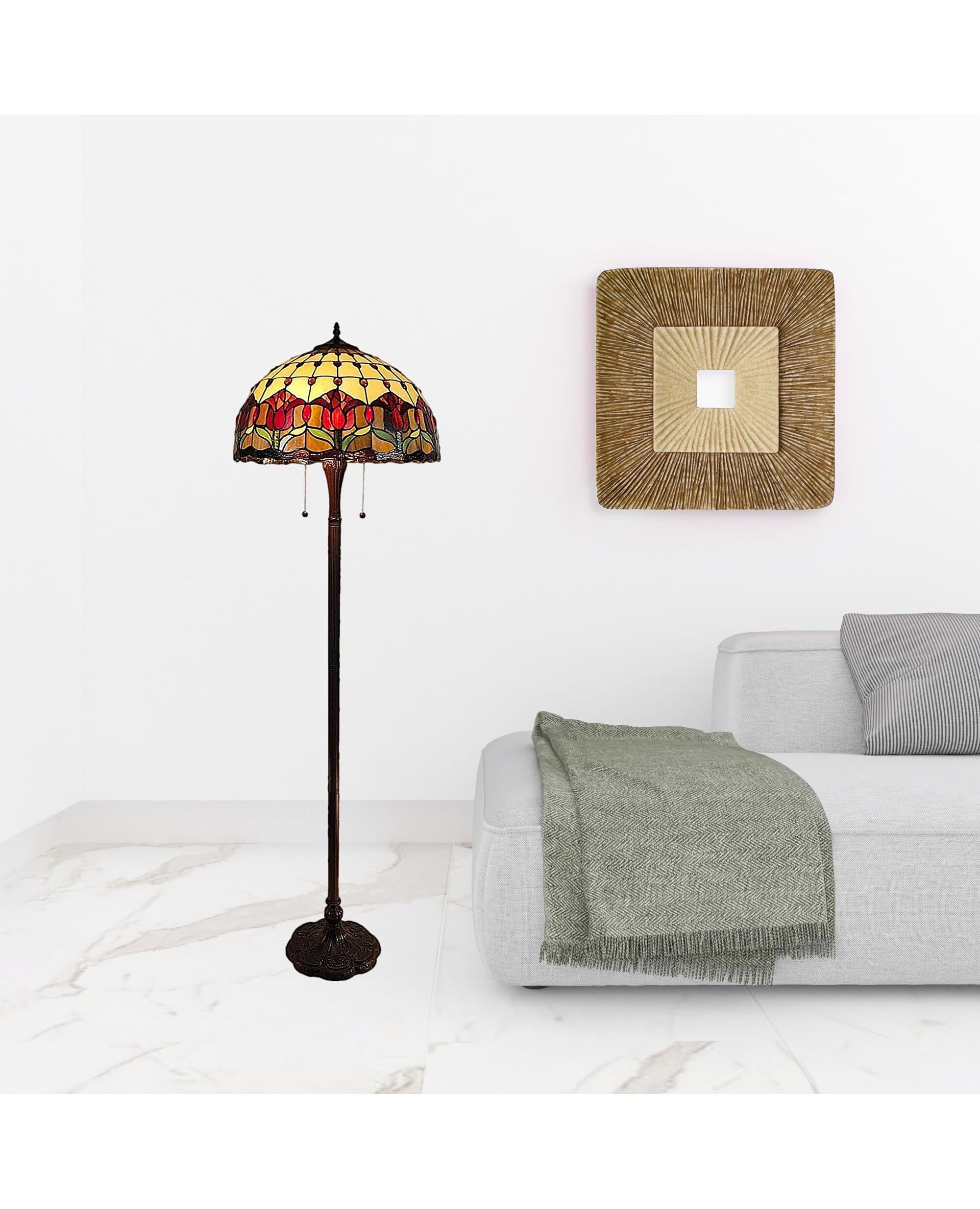 62" Brown Two Light Traditional Shaped Floor Lamp With Red Flowers Stained Glass Dome Shade
