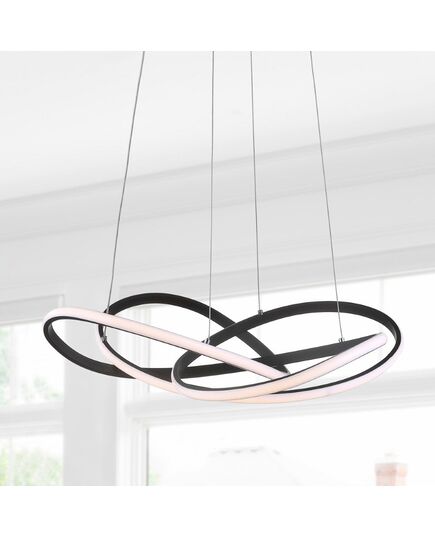 Intertwined curves of LED lights emitting from black iron create a look that is soft and elegant from materials traditionally known for their industrial strength. At 25" in diameter, it is stunning over a wood dining table, or incorporated as a way to soften industrial decor. With 36 watts of integrated LED lights, it is bright enough for a kitchen, but elegant enough for a living room, making it a versatile selection for anywhere in the home.