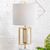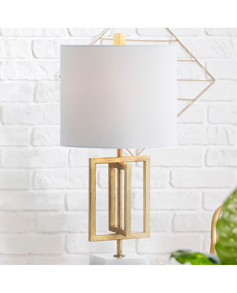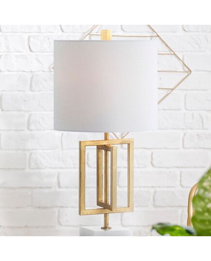 We love the geometric structure of this brass body paired with the marble-like base--a pairing that feels contemporary and luxurious. Featuring a silk wrapped cord and a brass finial, this piece is stylish from head to toe. At 20" high, this lamp is perfectly scaled to sit atop a desk, armoire, or side table.