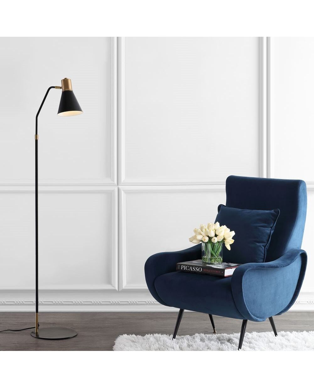 Modern and functional, the floor lamp has a matte black finish accented with brass-gold. The metal shade's white lining maximizes light output, for the perfect work or reading lamp. The flat round base slips easily under the edge of a chair or sofa. Solid black metal shade directs light downwards, right where you need it. The 72” cord has a convenient in-line switch, and is silk-wrapped for an elegant finish.