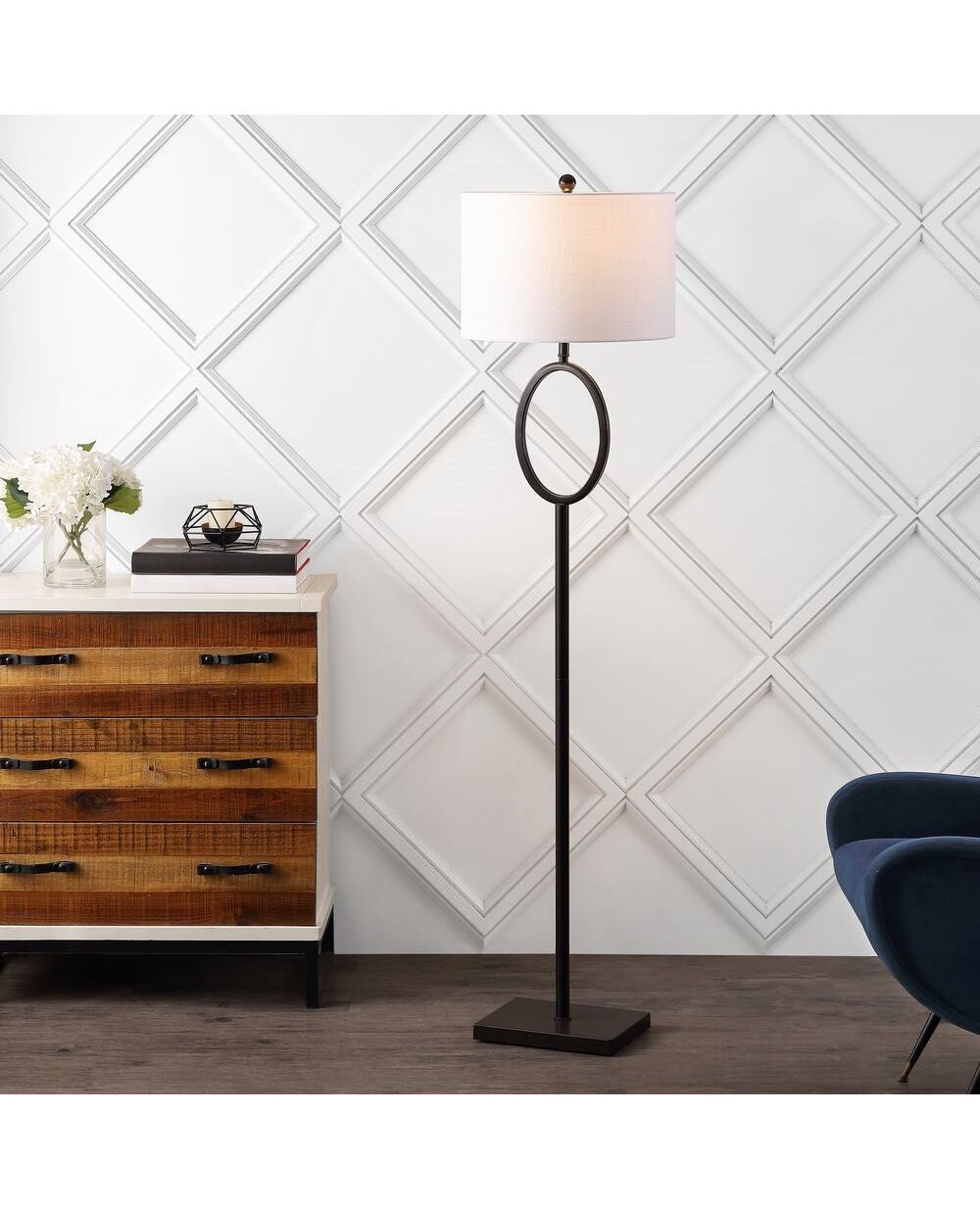 Supported by a square metal base, this floor lamp shows off a slender nickel-plated body that's punctuated with a dynamic hoop detail. A crisp cotton drum shade and silk-wrapped cord complete the piece. Great for extra reading light next to a sofa or chair.