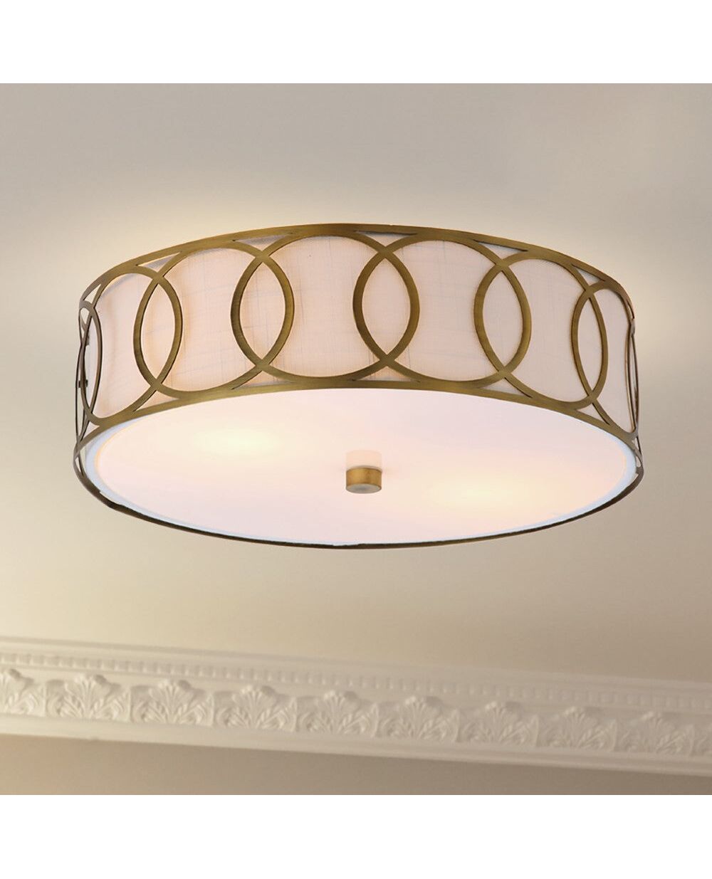 Fashion-forward but smaller scale, this fixture only drops 5" from ceiling to base, and is just 12.25 inches in diameter -- the perfect size for small rooms such as mudrooms or powder rooms. A linen shade is complemented with a geometric fretwork of overlapping circles that adds a decorative touch to any interior. We love how the bottom easily screws off for easy bulbs changes and how the chrome works well with other household hardware and appliances.
