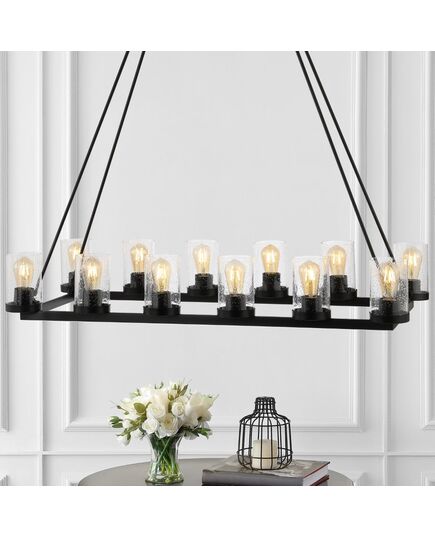 Perfectly sized for a kitchen island, kitchen table or medium dining room, this linear chandelier combines black metal and clear seeded glass for rustic-industrial chic. The wrought-iron style frame features twelve Edison-style LED bulbs for a vintage touch. This versatile linear pendant is ideal for modern farmhouse dining rooms as well as rustic, French Country, Spanish and industrial spaces.