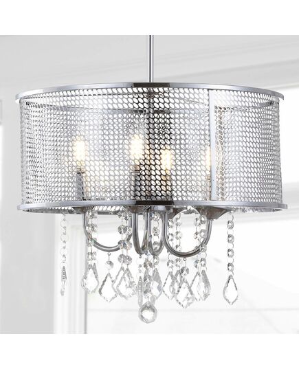 Shimmering with veiled elegance and the luminous glow from three bright bulbs reflecting off the metal mesh shade, this metal and crystal chandelier will not go unnoticed! The gleaming chrome rods are adjustable to perfectly fit your space, and the dangling faceted crystals are framed by a shimmery sheer shade that lends this fixture a timeless effervescent appeal. Whether for over a dining room table or adding a lux touch to a bathroom, this fixture would stun with any decor.