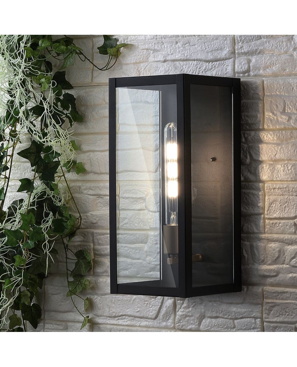 Our stylish black finish gives a minimalist edge to this modern, rectangular light fixture. The tall, Edison-style LED bulb and brass-toned fittings add industrial flair. This outdoor lantern's clean lines are ideal for a mid-century modern or contemporary front entry, walkway or patio.