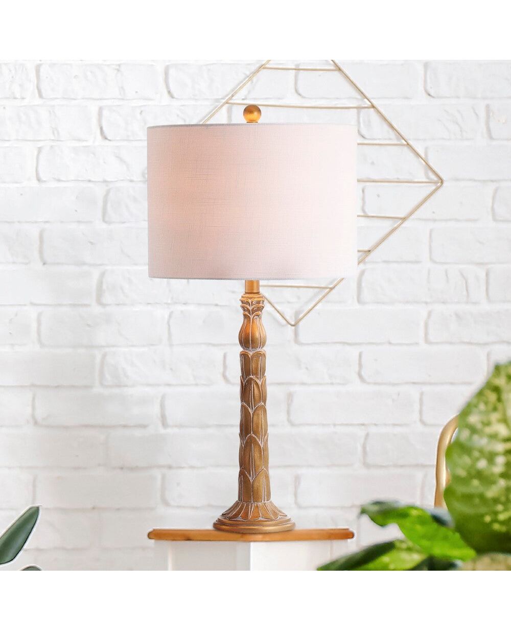 Cast from an antique candlestick, the mold used to create this resin lamp base features a beautiful embossed leaf design, originally carved by hand. The antique gold finish warms its contemporary structure and gives great vintage appeal. A white cotton drum shade and opulent pediment are eloquent end caps completing the look.
