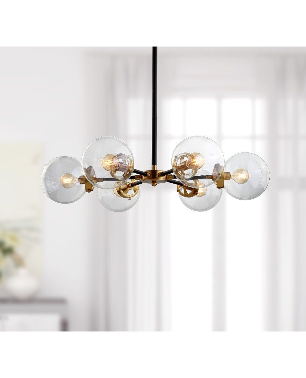Featuring a brushed brass and flat black finish, this six-light chandelier is both neutral and decorative. With clear glass spheres, this chandelier is decorated carefully to evoke elegant detail. The spoke layout of the arms would be particularly well suited to above a round dining table or a contemporary kitchen island.