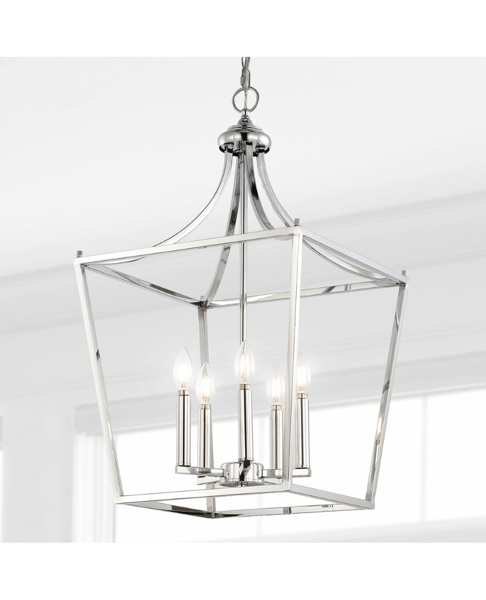 Perfectly sized for a kitchen island, breakfast table, entry or hallway, the timeless silhouette of our pendant lantern is updated with a dark oil-rubbed bronze finish. The open frame contains five candles with LED bulbs that provide warm light for a vintage touch. With its adjustable chain, this versatile lantern is ideal for a modern farmhouse kitchen, rustic entry, or traditional foyer.