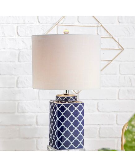 Nothing combines classic and bold like the trellis pattern, which makes it a perfect fit for the equally-versatile square ginger jar shape. A crisp linen drum shade with rolled edges tops the look. Finished with a lucite finial and silk-wrapped cord.