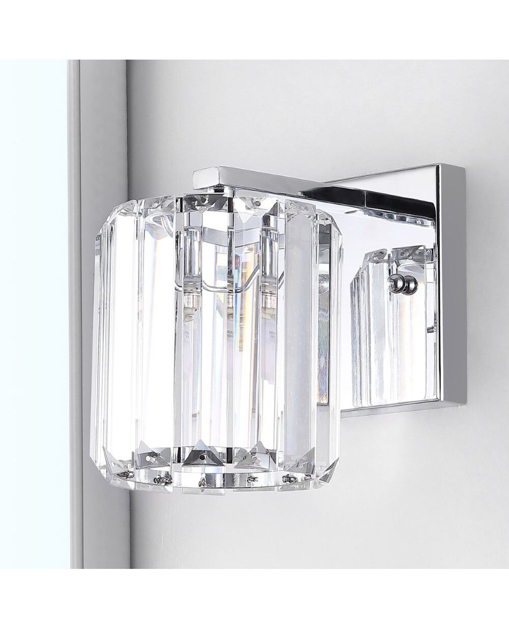 Bring on the glam with our Art Deco-inspired glass prism wall light. A single LED bulb casts a warm glow, providing plenty of light. Sparkling glass and chrome add feminine style to your bath vanity, kitchen, hallway, or entry.
