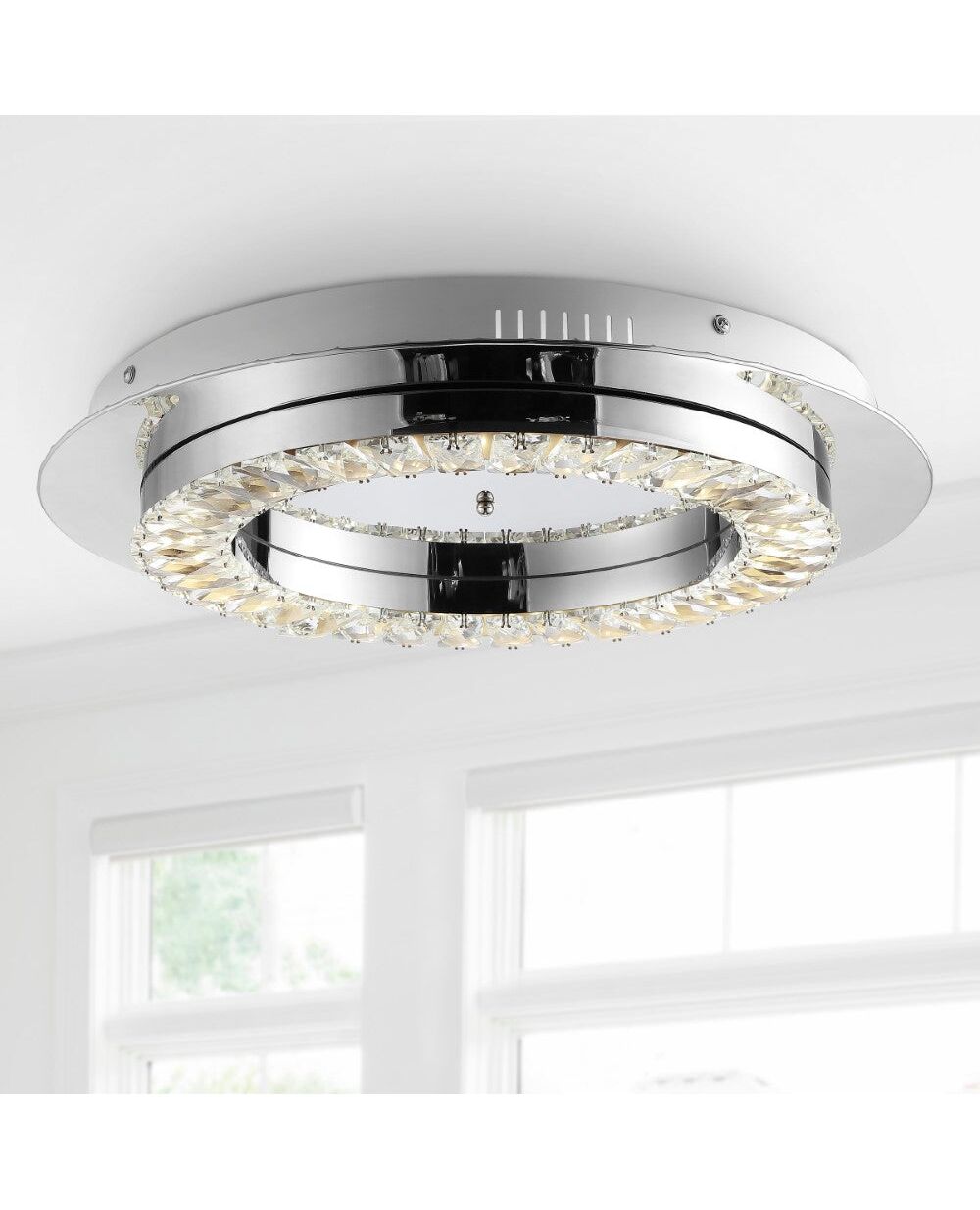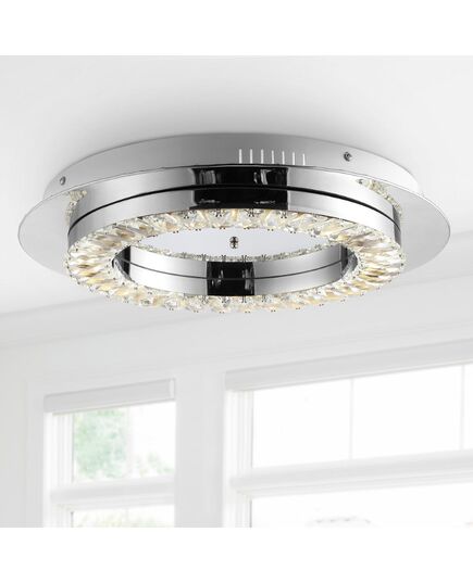 Modern, sparkling, and completely different, our flush-mounted ceiling light makes a contemporary statement. The clean, simple design features a chrome ring surrounded by crystals arranged on a flat surface. This low-profile light fixture is versatile enough to use almost anywhere.