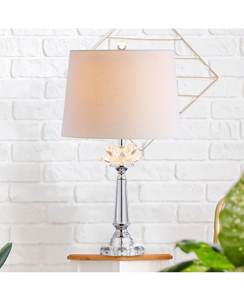 A classic crystal candlestick base stems into a glamorous cluster of faceted crystals before culminating in a slightly taped cotton shade in this luxe table lamp from Jonathan Y. Featuring a silk-wrapped cord and topped with a crystal clear finial, this lamp boats classic style with updated finishes. With chrome-plated components and an included replaceable LED bulb, you can rely on this lamp for years to come.