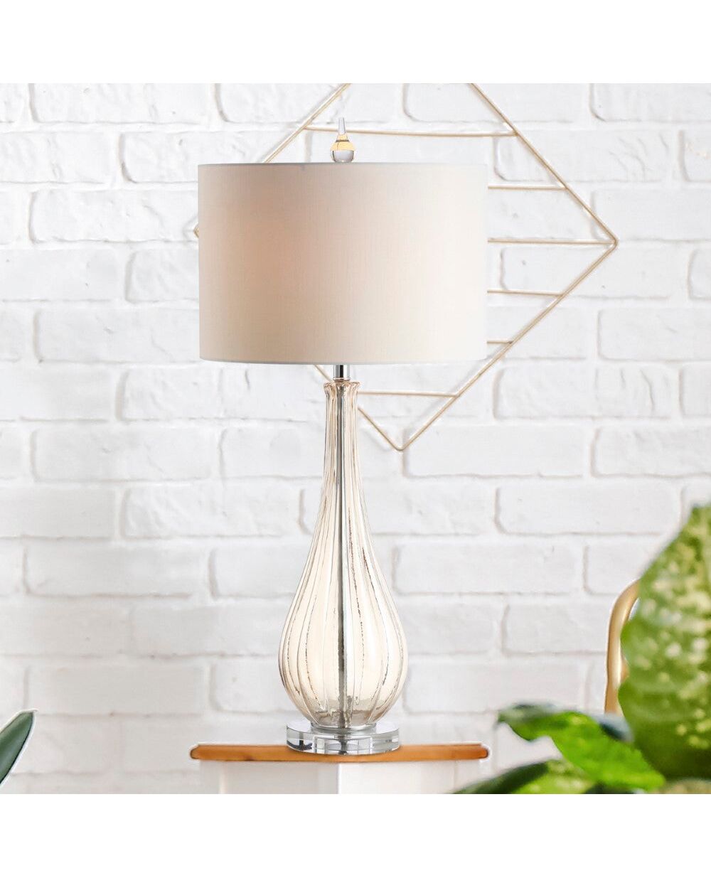 Brighten your interior with this ultra chic table lamp with a gorgeous contemporary teardrop silhouette. Blown from glass with a champagne tint, the finished design is both playful and classic Finished in a matching finial and silk-wrapped cord, elegance is in the details.